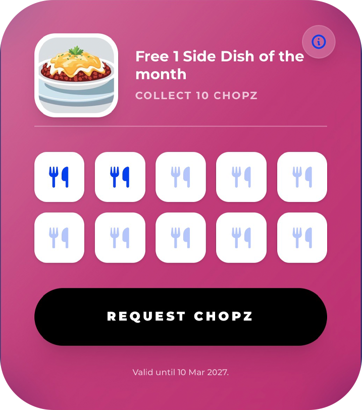 When customers scan the QR at your store, they collect chopz digitally. Once they reach the required number of chopz, they can redeem rewards.