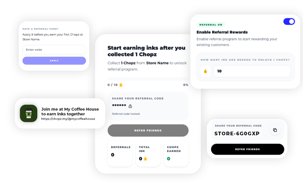 - Once the friend becomes an active customer, both of them earn rewards (e.g. Ink → converted into Chopz)
